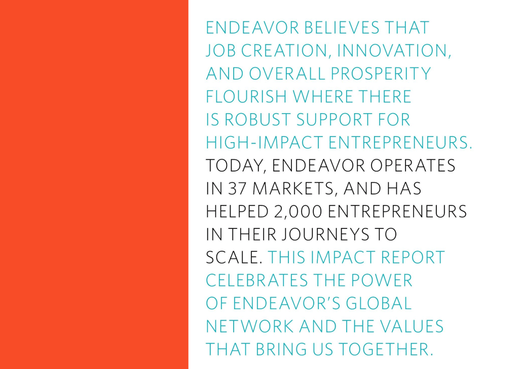 Endeavor is leading the global high-impact entrepreneurship movement to drive long-term economic growth and build strong entrepreneurship ecosystems in growth markets by selecting, mentoring, and accelerating the best high-impact entrepreneurs.